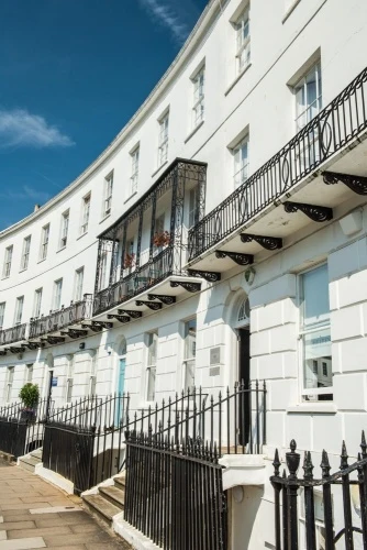 Many of the more upper-class terraces, such as those designed by John Nash surrounding Regents Park in London, are entered through triumphal arches reminiscent of ancient Rome, These arches, generally in stucco, lead to grand rows of houses, with carefully balanced pediments fronted by massive pilaster columns. The best remaining terraces built in this grand style are in London, Cheltenham, and Brighton.