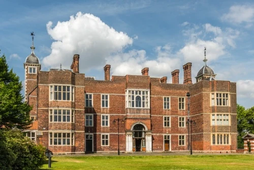 The house is built of red brick to a double E design, with decorative chimney stacks and turrets. White stone is used for doors, windows and corner quoins. Projecting from the west front is the richly carved entrance porch. The house interior is stunning, with ornate plasterwork ceilings and richly carved fireplaces throughout. One very striking fireplace in the Jenkins Room is carved from oak.