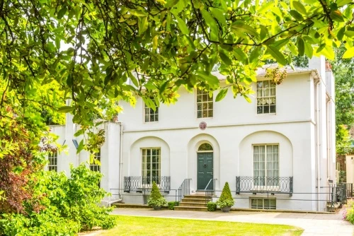 This Grade I listed white stucco house in Keats Grove, Hampstead, was built in 1815, one of a pair of semi-detached houses called Wentworth Place. From the exterior, the two houses looked like one residence, but an interior partition wall created two separate living areas.
