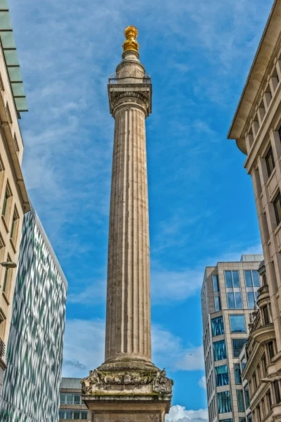 After the devastation of the Great Fire of London in 1666, Parliament passed a law that a monument should be erected on or near the place that the fire started at a bakehouse in Pudding Lane. To this end, Sir Christopher Wren was retained to design a column, or pillar, to commemorate the fire and the great losses incurred by the city. The result is the London Monument, or, as it is more properly termed, simply 'Monument'.