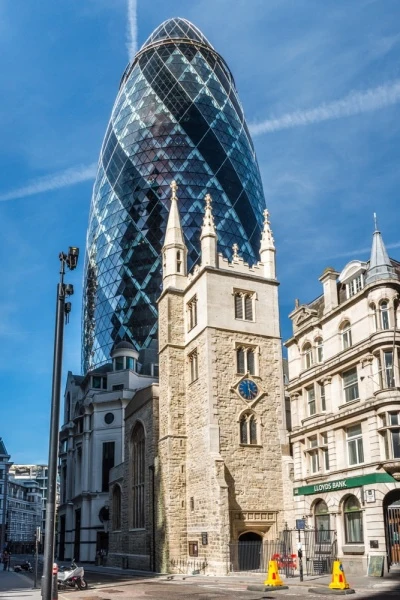 It is perhaps ironic that the church that gained its name from a large maypole shaft now stands almost in the shadow of another large London landmark; 30 St Mary Axe, popularly known as The Gherkin.