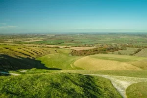 The best place to view the Vale of the White Horse is from the Ridgeway path. When you see the patchwork of pale green and gold fields spread out below you, it is hard to imagine a more English scene.