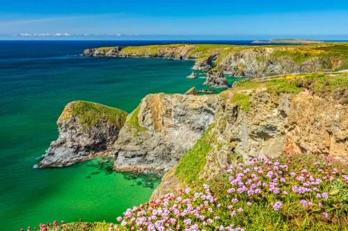 From the cliff tops, the panoramic views stretch across Carnewas Bay, offering breathtaking vistas where the deep blue ocean contrasts vividly with golden sands and dark, imposing rocks.