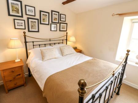 The stairs lead up to a lovely romantic bedroom with feature fireplace and cast iron bed. The bathroom includes a cast iron bath, making this delightful Askrigg cottage a great romantic retreat. Outside this Askrigg cottage is a shared, south-facing lawned garden area with wonderful far-reaching views.
