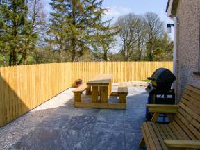 Enclosed front and side garden with lawn, hot tub, furniture and BBQ