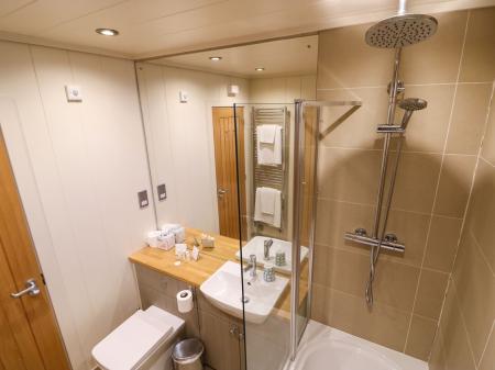 Two bedrooms: 1 x double with en-suite shower, basin and WC, 1 x twin - double on request - with en-suite shower over bath, basin and WC