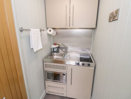 Electric combination microwave/convection oven/grill, electric hob, fridge with ice box, toaster, kettle, Smart TV and WiFi