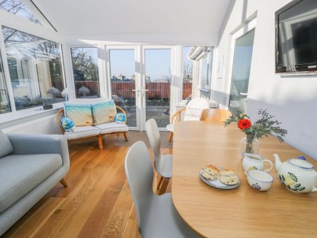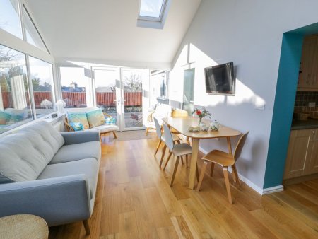 The well-equipped kitchen provides everything needed for home cooking and leads through to a spacious conservatory at the rear, complete with additional seating, a TV and a second dining area for relaxed mealtimes together. There are three neatly presented bedrooms to choose from, including a king-size, a twin and a bunk room. The bunk room also features a cot bed, ideal for younger guests.
