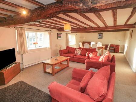 The living areas in this characterful farmhouse consist of a kitchen/diner equipped with a range cooker, microwave, fridge/freezer, washing machine and dining seating, a living/dining room with TV and a conservatory. There are three bedrooms, a double with en-suite shower room, a double, and a twin, along with a bathroom and a cloakroom. Outside, a garden with decking and furniture and a shared rear garden, as well as parking.