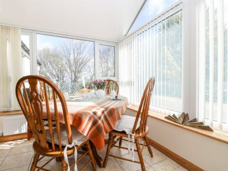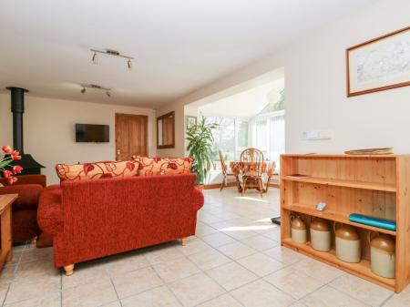 Arranged over one floor with three steps to entry. The generous open plan living space is bright and airy and warmed by the real flames of a large woodburning stove positioned in the corner of a comfortable sitting area furnished with matching cosy red sofas. A dining area occupies a conservatory style section surrounded by glass providing a lovely sunny position for family meals.