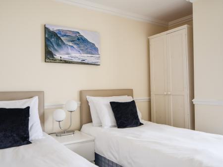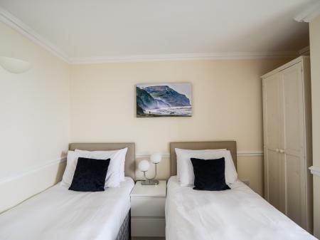 The living areas in this second-floor apartment consist of an open-plan kitchen, dining area and sitting area with an electric oven, gas hob, microwave, fridge/freezer, washer/dryer, dishwasher, TV, gas fire and balcony with furniture. The bedrooms consist of a king-size and a twin, along with a bathroom with hair dryer. Outside there is off-road parking for one medium-sized car.