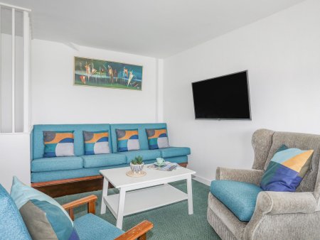Set across two floors and hosting thee bedrooms including a double with en-suite basin, a ground-floor double, along with a ground-floor bathroom and first-floor open-plan living space with electric stove. The kitchen contains an electric oven and hob, microwave, fridge and dishwasher. For entertainment, guests are provided with a TV with Freeview and WiFi.