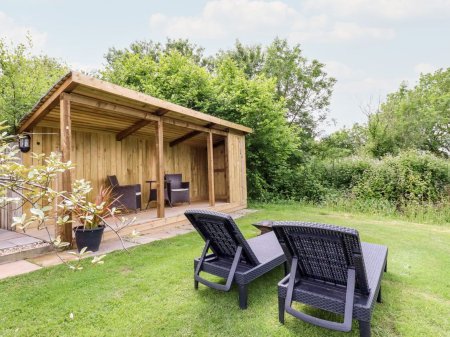 Outdoor furniture with sitting area, private hot tub (fire logs are provided) and large shared grassed area