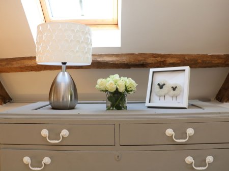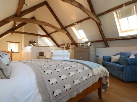 A sumptuous bed dressed with plump pillows and soft cotton bed linens awaits in the first-floor bedroom. An intimate and open-plan design, a low wall separates the bed area from the bathroom area with its bath, sleek shower, and a loo tucked into the corner. Expect to relax and be pampered with White Company hand and bath towels, luxurious toiletries, cotton bathrobes, and slippers.