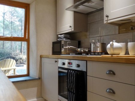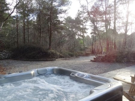Luxurious, stone-built single-storey cottage, surrounded by woodland with hot tub. Parking. WiFi.
