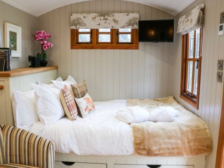 Little Silver Fox Silvery Grey in colour, this beautiful shepherdsâ hut sits midway within the orchard, perfectly positioned to enjoy the magnificent views of the valley below. Step inside to the studio style accommodation with luxury king size bed, seating area with foldaway table and kitchen fitted with Belling electric cooker and hob, Smeg fridge and wood burning stove. A shower room with walk in shower is situated at the far end and completes the accommodation.