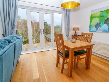 Outside, the enclosed deck offers elevated views across treetops, glimpses of the lake and the surrounding countryside. Listen for the gentle stream below or watch for visiting birdlife - serene reminders of the peaceful setting. For walkers, there are gentle routes around the grounds, along with nearby bridleways to explore.