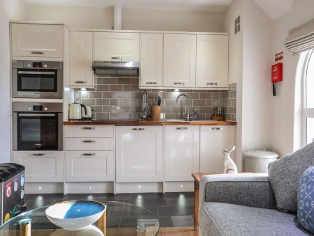 Harlech 5 - Matholwch is a second floor holiday apartment amongst five others set within the grounds of Harlech castle in Snowdonia. Like the others, this is a modern and luxuriously decorated holiday apartment ideal for a couples getaway. Shops, restaurants and cafes are all within a one minute walk! The open plan sitting room, kitchen and dining area is a lovely, bright space.