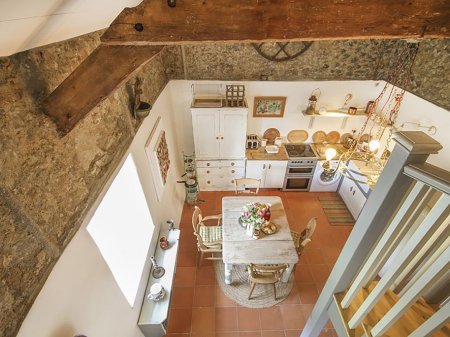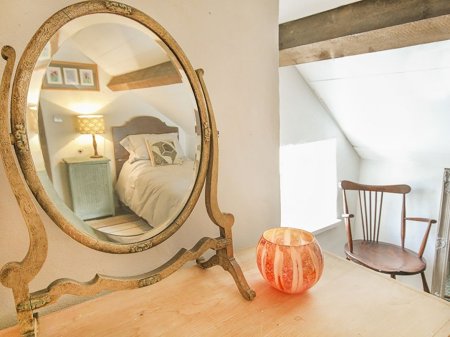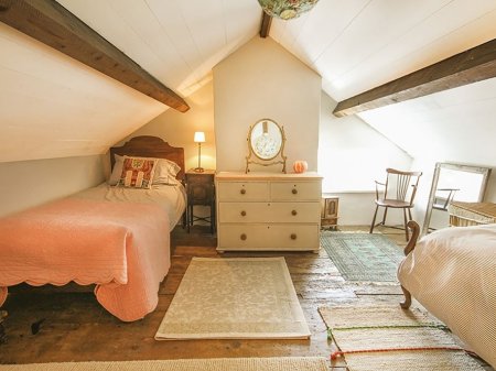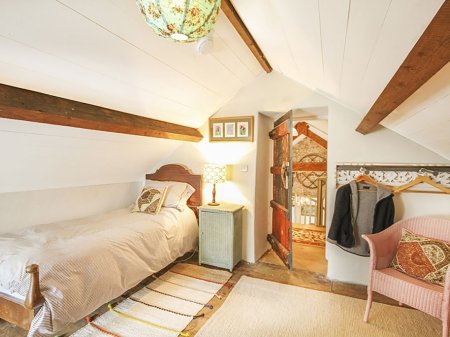 Stairs from the kitchen diner lead up to the bedroom which is furnished with antique small double bed and a single, perfect for a couple or small family. There is a small reading area with chair and lamp on the gallery / balcony overlooking the kitchen diner. The large garden has a variety of seating options and there is space for parking.