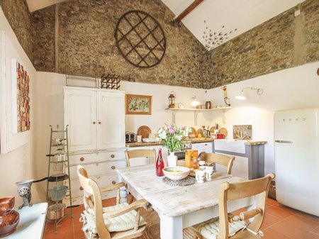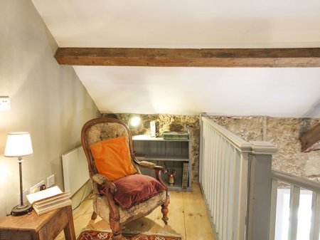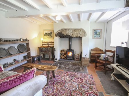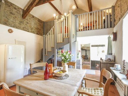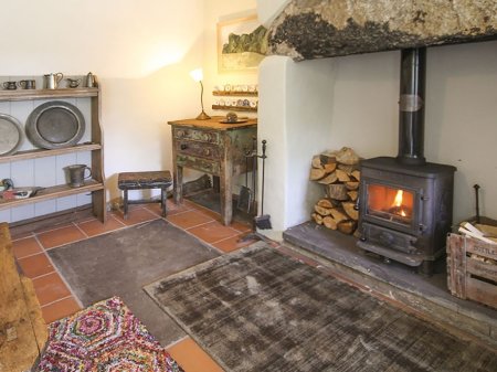There is a dining table and four dining chairs. The sitting room has a comfortable sofa and chairs, woodburning stove set in an inglenook and a flat screen TV. There is a downstairs shower, loo and wash hand basin.