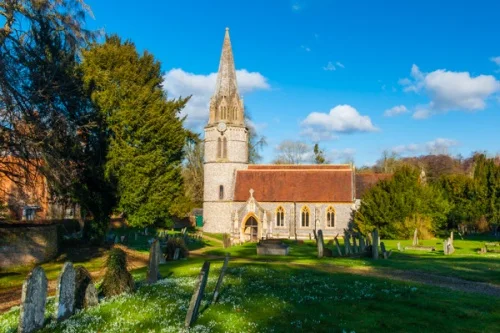 St Gregory's church stands beside the red brick manor of Welford Park, in a wonderful countryside area near the River Lambourn. The combination of the striking church with its pointed tower and the quiet dignity of the manor house makes for an almost perfect picture of rural England at its best.