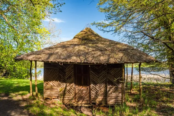 Hovering on the edge of the water is the Malay Hut, a thatched building in the style of a South Sea hut. This was originally installed in the centre of the lake, supported on wooden stilts. The stilts eventually rotted and the hut was moved to the bank for safety.