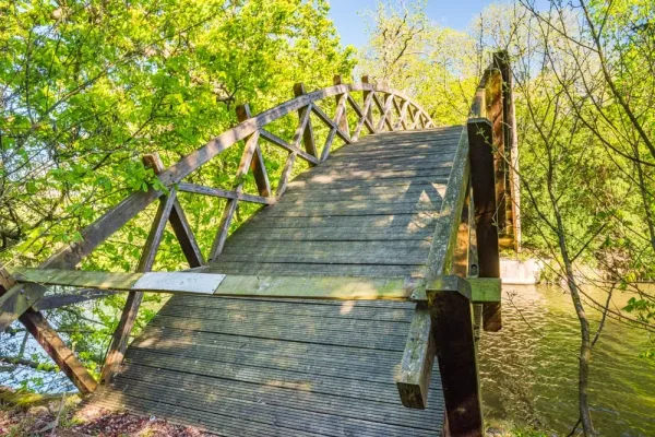 Capability Brown designed this picturesque stone bridge to disguise a change in elevation between the southern and northern reaches of the Warrells. Here, water cascades over a sloping spillway under the central arch.