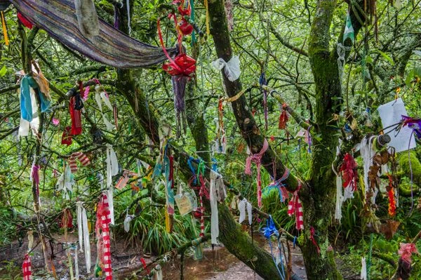 The idea is that if you are ill, you tie a piece of organic material to the tree, and bathe in, or drink, the sacred waters of the well. As the cloth slowly disintegrates over time, so too the illness or disability will pass.