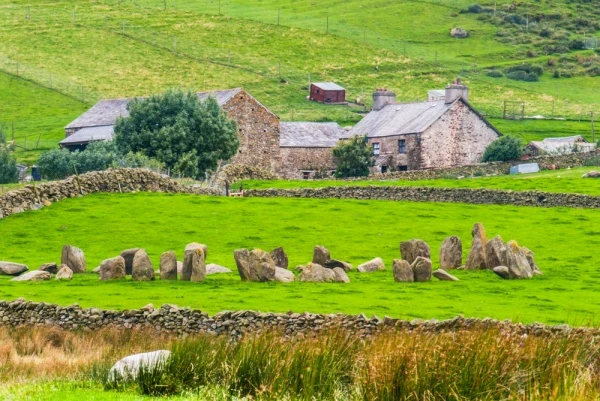 The track is also a public footpath, so you are perfectly within your rights to walk up towards the farm. You will see the stone circle come into view in the field below the farmhouse. The stones are in a private farm field, but it is extremely easy to see the circle from the track. It takes a 10-15 minutes walk to reach the stone circle, and of course, its a bit faster coming back downhill.