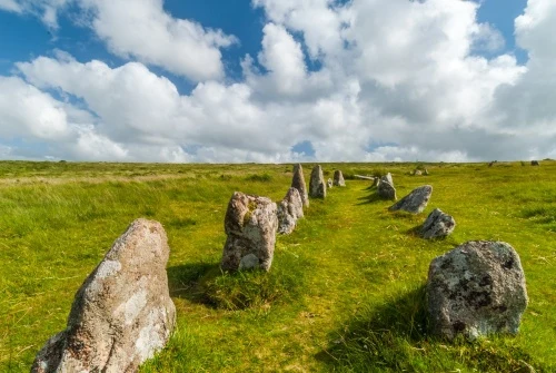 On the gentle slope of Shovel Down, near Chagford, is an impressive collection of Bronze Age stone rows, a four-fold stone circle, a cairn circle, an ancient settlement, a solitary standing stone known as the Long Stone and another known as the Three Boys Stone. This remarkable ceremonial landscape is just a short walk over the moor from Scorhill Stone Circle and the Tolmen Stone.