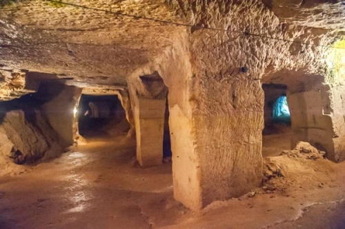 The Normans extended the Roman tunnels, and their work is distinguished by rectangular columns supporting the cave roof. They also carved out several small side-tunnels, exploring the limits of the limestone veins.