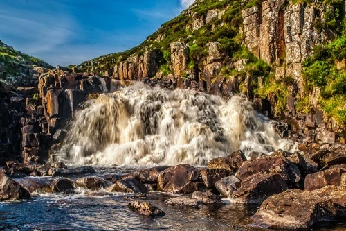 From there, follow the obvious footpath south along the shore towards the dam head. The waterfall begins immediately below the dam. The Pennine Way trail crosses the outflow beneath the cataract.