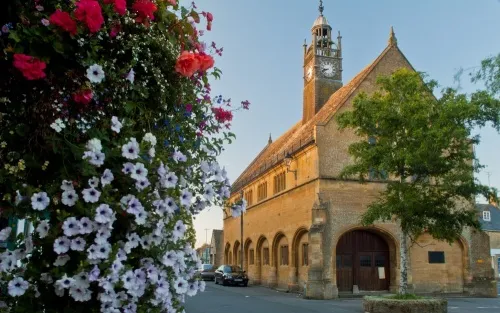 Moreton-in-Marsh is a lovely market town in the northern Cotswolds, situated on the old Roman Fosse Way, famous for its wide High Street. The very wide High Street has an attractive market hall on an island in the middle, and pretty golden-toned buildings of Cotswold stone line the road.