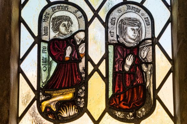 The easternmost window in the north aisle retains fragments of 15th-century glass. There are three tracery lights, one depicting the Virgin Mary and the others depicting a man in a crimson doublet and yellow hose and a woman in a red gown.