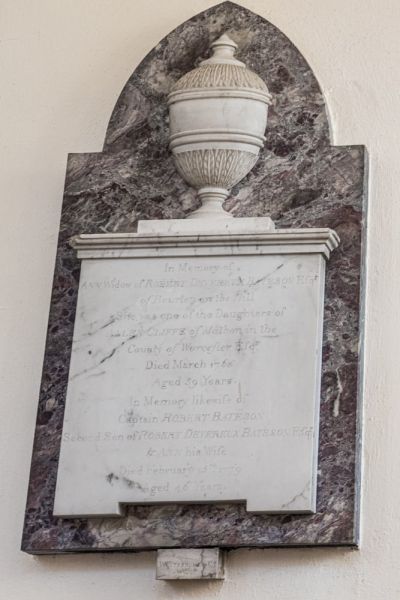 More members of the Batesons are remembered, with notable tablets to Robert Bateson (d. 1763) and Susannah Bateson (d. 1768). Perhaps the finest is a grey marble tablet with decorated with a heraldic shield and cupids in memory of Robert Bateson (d. 1736).