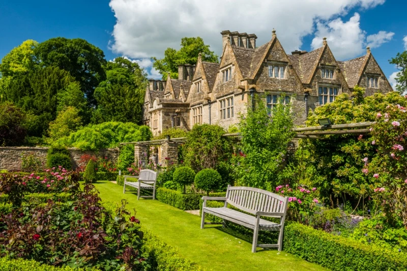 Other garden features include a reconstructed folly and a formal rose garden, lush with colour at the height of summer. There are tall, clipped hedges forming a secret garden area, and a beautiful pergola near the house. The gardens stretch to several acres, with glorious views over the surrounding Cotswold landscape, and are well worth a visit in their own right.