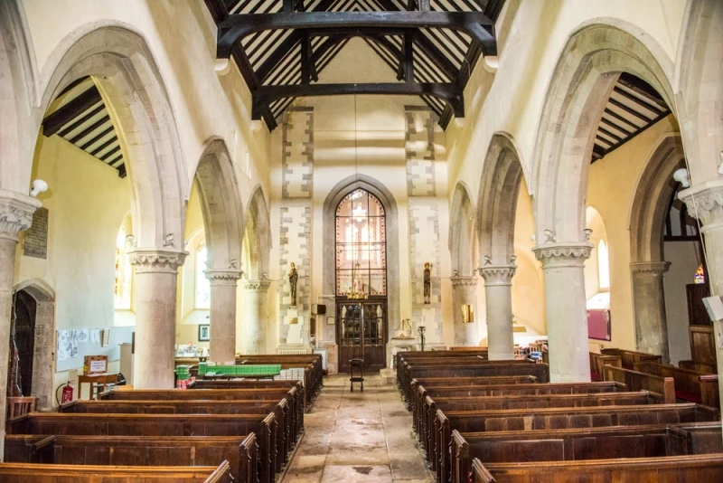 Restoration in the Victorian period swept away many medieval features, including all the old windows. One Norman feature that did survive is the south doorway, dating from around 1200. The end walls of both north and south aisles have early 13th-century windows, and there is a 12th-century priest's door set into the south wall of the chancel.