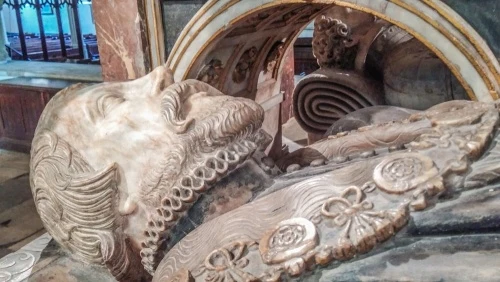 This sumptuous piece of marble and alabaster sculpture was created in 1594 by a Flemish sculptor named Gerard Johnson and honours the first Earl and Countess of Southampton as well as their son and heir (d 1582).