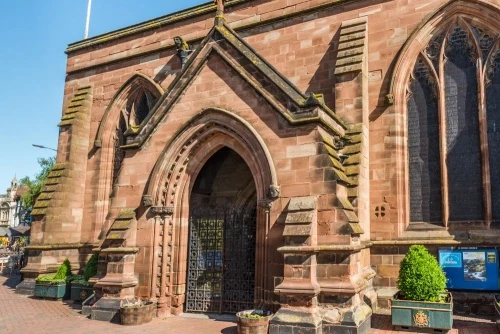 The church is opposite Shire Hall and the bus station on St Peter's square. It is easily reached on foot from the Cathedral and is just a stone's throw from the Black and White House Museum on High Town.