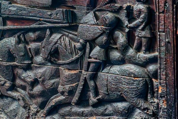 By far the most interesting historical treasure inside the church is a richly-carved 14th-century wooden muniments chest in the south chapel. This chest is said to have been found afloat in The Swale. The front of the chest, carved around 1375, has carvings that depict a pair of knights jousting. The carving has also been interpreted as a battle scene. Each knight is attended by a squire, while two onlookers watch from towers above the conflict.