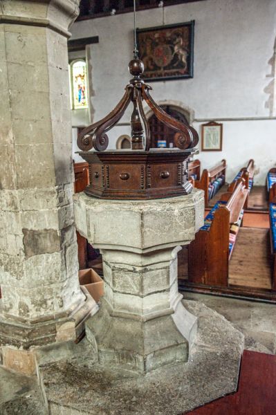 The font is Norman and there are Norman mason's marks on the arch of the south doorway, along with carvings interpreted as crusader crosses. The mason's marks are similar in style to mars found at Canterbury Cathedral, suggesting that the same stonemasons worked at both sites.