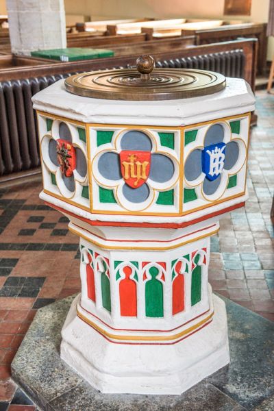 The striking font, painted in rich colours, dates to the 15th century, though the painting is modern. The stone pulpit is a product of the 1860s, inlaid with mosaic and boasting marble pilasters.