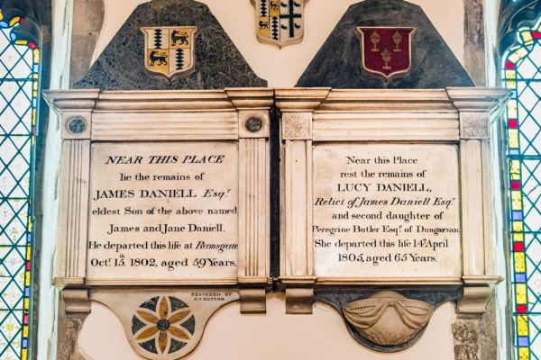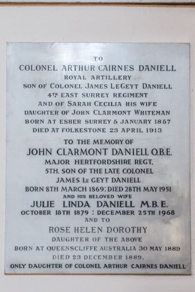 On the wall is a lovely little stone tablet to Thomas Stoughton, who died in 1611 at the age of 26.Also on the wall are a pair of Georgian memorials to members of the Daniell family; James (d. 1802) and Lucy (d. 1805). A later memorial to the same family commemorates Colonel Arthur Daniell, Royal Artillery, who died in 1913.