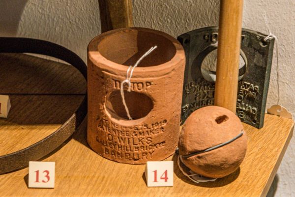 Other displays include traditional agricultural tools, including sheep shears, a haystack testing rod, Victorian pitchforks, and a bone-crushing machine used to make fertiliser. One humorous artefact is a match box from the Crown Inn in Cowden. The box is printed with this rhyme: