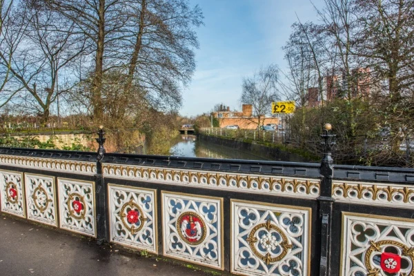 The present Bow Bridge is a Victorian replacement for the medieval bridge, built in 1862. The bridge is made of iron and its railings are decorated with white roses, Richard's symbol as a member of the House of York, as well as Richard's emblem of a white boar and his motto 'Loyaulte me Lie' (Loyalty Binds Me). Not showing favouritism, the bridge is also decorated with the red Tudor rose. On a stone piling at the west end of the bridge is an inscription reading: