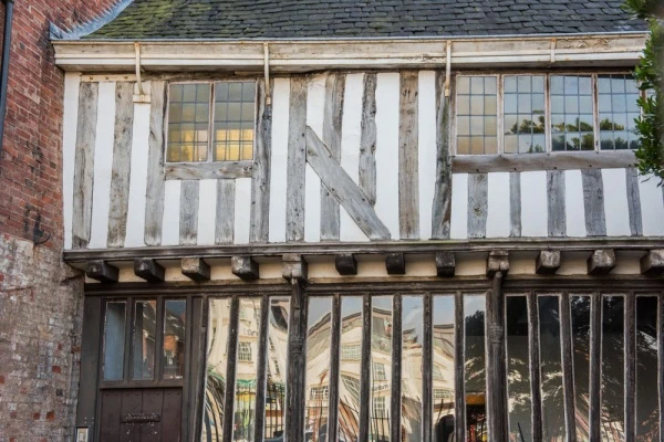 The medieval core of Leicester was once filled with timber-framed buildings like this, but now only Wygston's House and nearby Guildhall remain. The guilds of Corpus Christi and St George had their halls nearby, so it is possible that Wygston's House had a guild connection, which may have helped spare it from destruction when other, more opulent timber-framed houses were demolished.