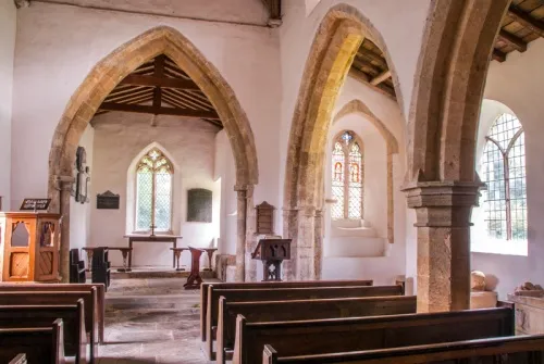 The Early English porch gives access south arcade of two bays. There was once a north aisle, but this has now disappeared. The east window of the south aisle still retains fragments of 14th century stained glass depicting St Catherine. The timber roof of the nave is worth noting; it is 17th century and features some lovely woodwork. At the west end of the nave is a poor box on a stand. The very worn box is inscribed with the words, "This is God's treasury. Cast on mite into it. 1639."