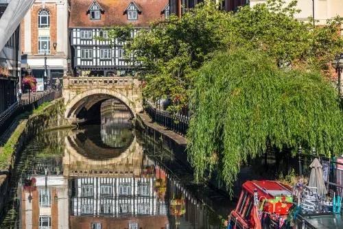 The bridge now supports a row of timber-framed shops erected in 1550. Steps lead down beside the bridge to a riverside walkway, where you can more easily see the bridge structure from beneath.