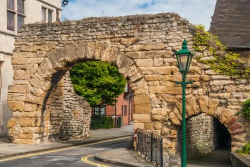 The Newport Arch dates to the start of the 2nd century AD. It gave access from the city to Ermine Street, the main Roman road north to York. It is famous as the only Roman arch in Britain still in use for daily transportation.