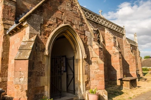 Set into a niche is the head of a 14th-century churchyard cross, with carvings on each face depicting a Crucifixion, a warrior, a robed priest, and figures of a Madonna and Child.